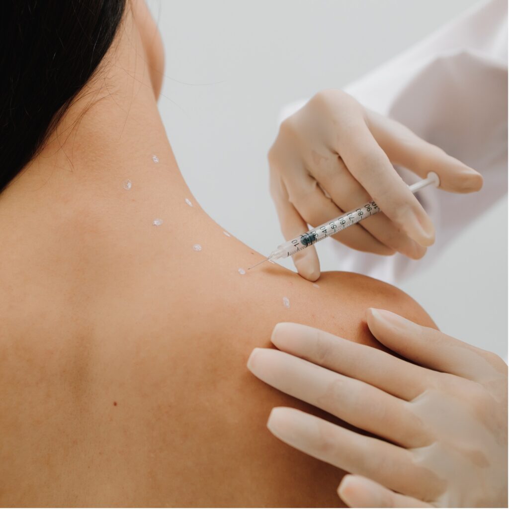 Infiltración de toxina botulínica en músculo trapecio para disminuir hiperactividad muscular, aliviar tensión y modificar visualmente la transición cuello-hombros.